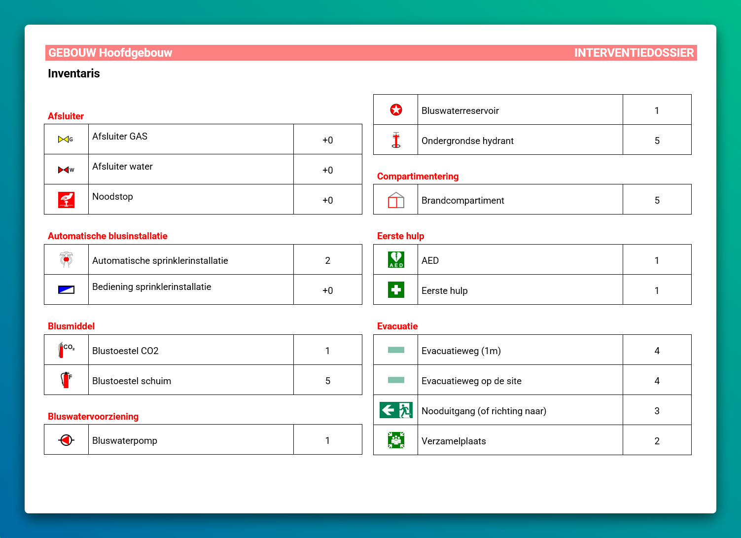 - Gevaarlijke stoffen: GHS-symbolen zijn toegevoegd, samen met de naam, hoeveelheid en locatie in de sectie 'Gevaarlijke Stoffen'. Wanneer je gevaarlijke stoffen aanduidt in het project met de GHS-iconen, worden deze automatisch opgenomen op het voorblad van het interventiedossier.