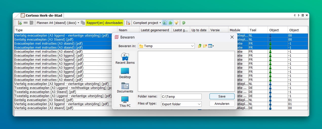 Met deze functie kun je de laatste versie van alle geselecteerde rapporten in één keer downloaden naar een gewenste map. Dit bespaart tijd en verhoogt de efficiëntie!