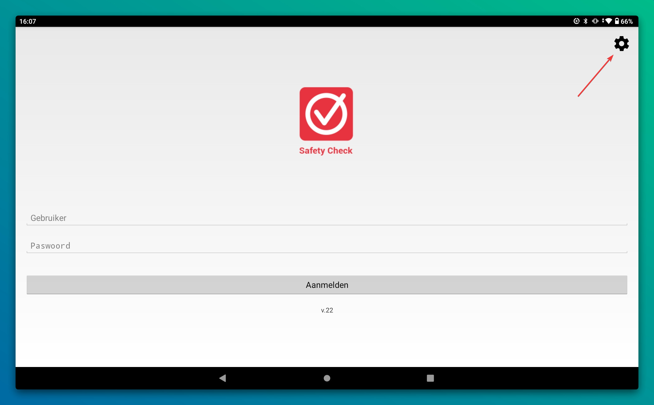 Het eerste scherm dat je te zien krijgt is het login scherm. Eer we kunnen inloggen en inspecties kunnen doen moeten we eerst de server instellen. Dat doen we met het tandwiel icoon rechts bovenaan het scherm.