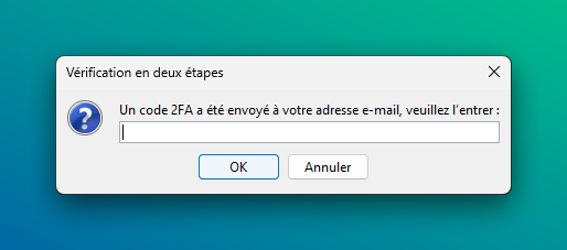 Vous recevez maintenant un code 2FA (6 chiffres) à l’adresse e-mail saisie. Entrez ce code.