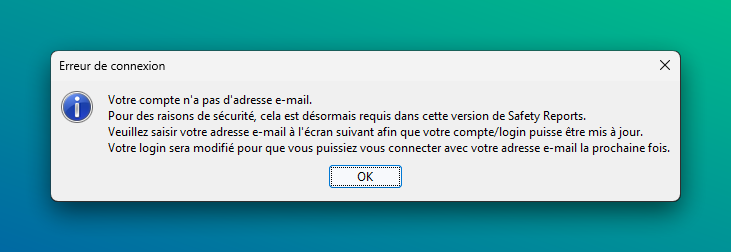 Cliquez sur OK pour être automatiquement connecté avec votre adresse e-mail dans Safety Reports.