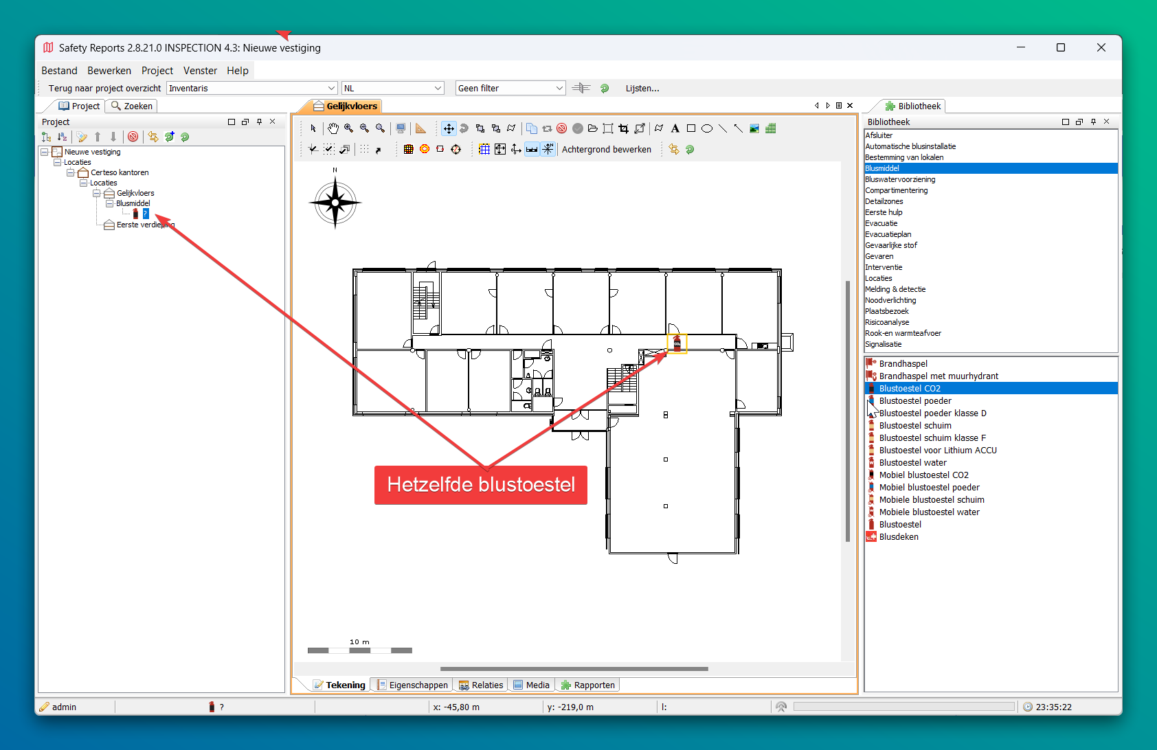 Iconen voegen we toe uit de bibliotheek. Kies aan de rechter kant de categorie "Blusmiddel" en kies onderaan een "Blustoestel CO2". Sleep dit blustoestel op het verdiepingsplan. Waar je het icoon los laat komt het blustoestel te staan op het plan. Het blustoestel komt niet enkel op het plan terecht maar ook in de locatieboom aan de linker kant onder de verdieping waarop we het blustoestel geplaatst hebben.