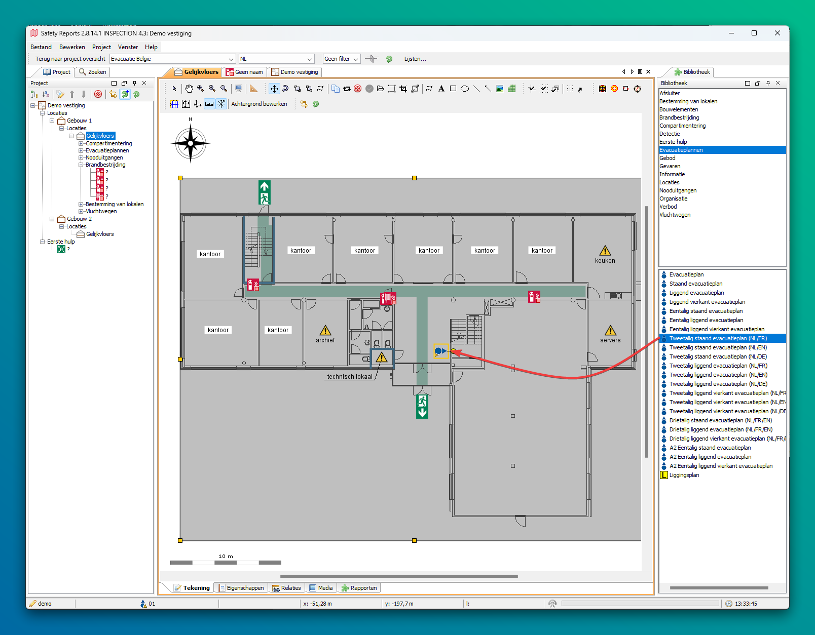 We openen de verdieping waarom we het evacuatieplan willen toevoegen. Uit de bibliotheek plaatsen we een Evacuatieplan uit de categorie evacuatieplannen op het plan. Wanneer je een evacuatieplan kiest uit de bibliotheek kan je kiezen uit heel wat formaten en talen op het plan: