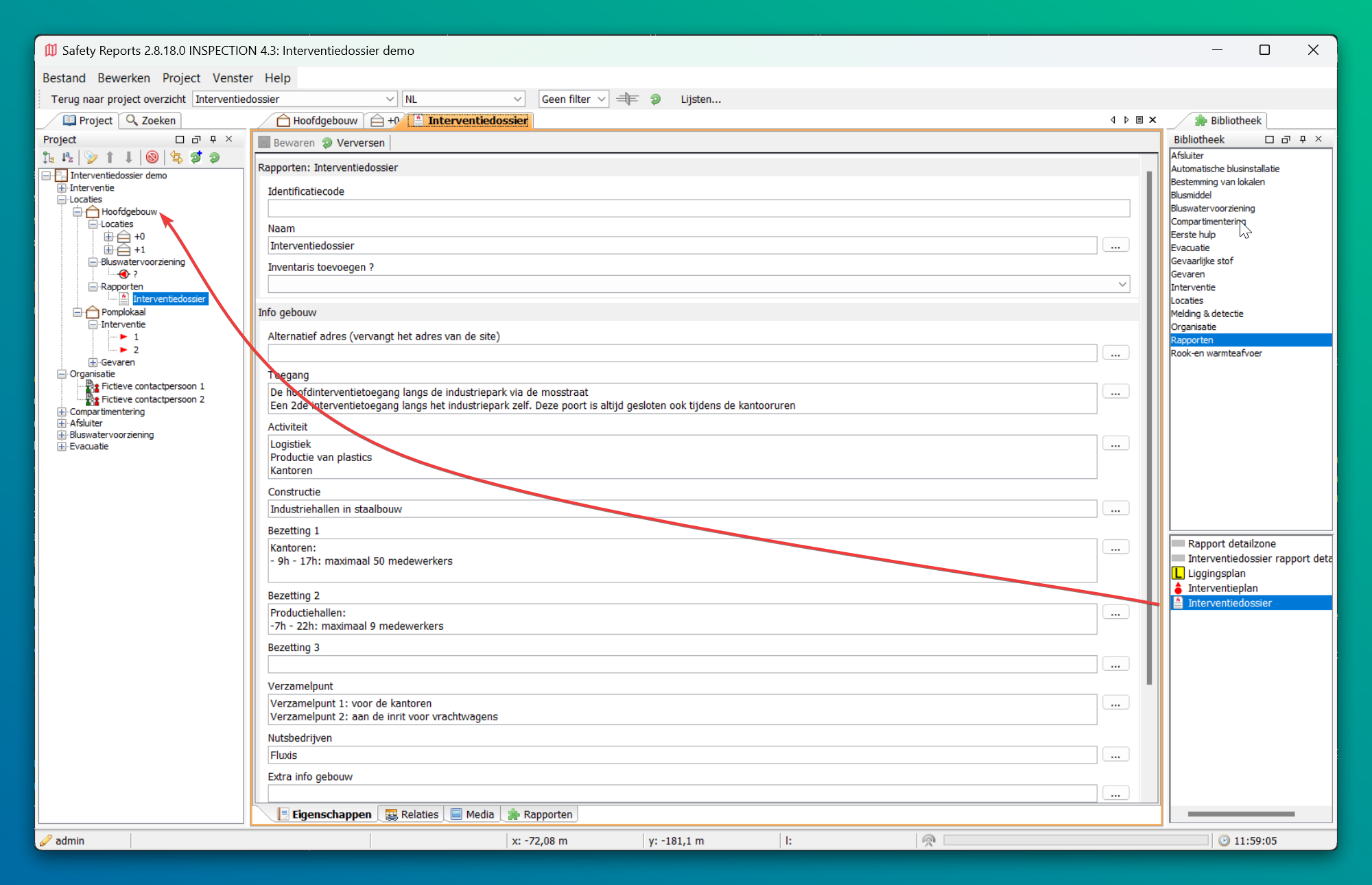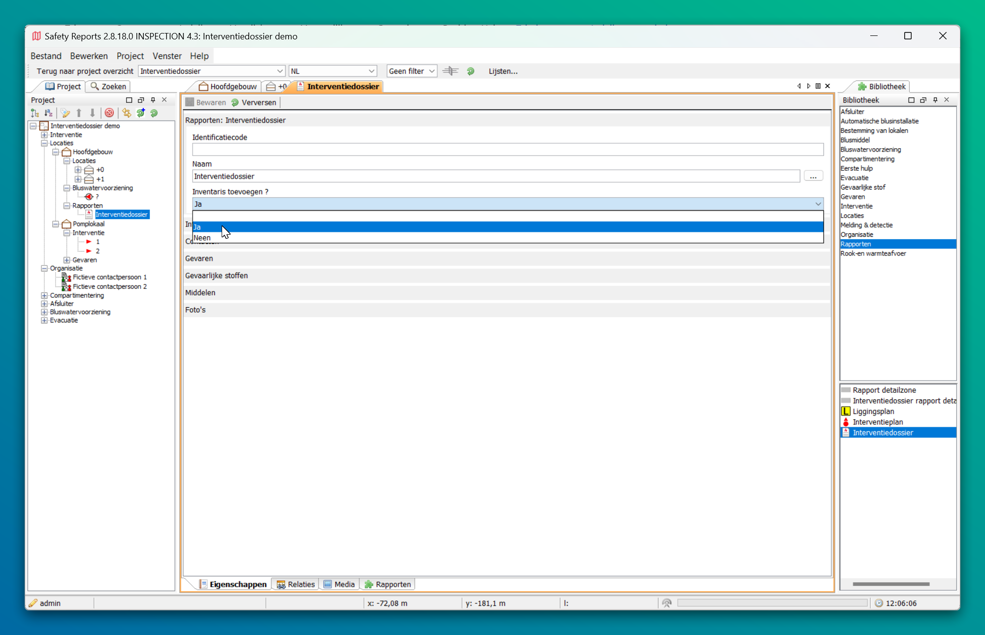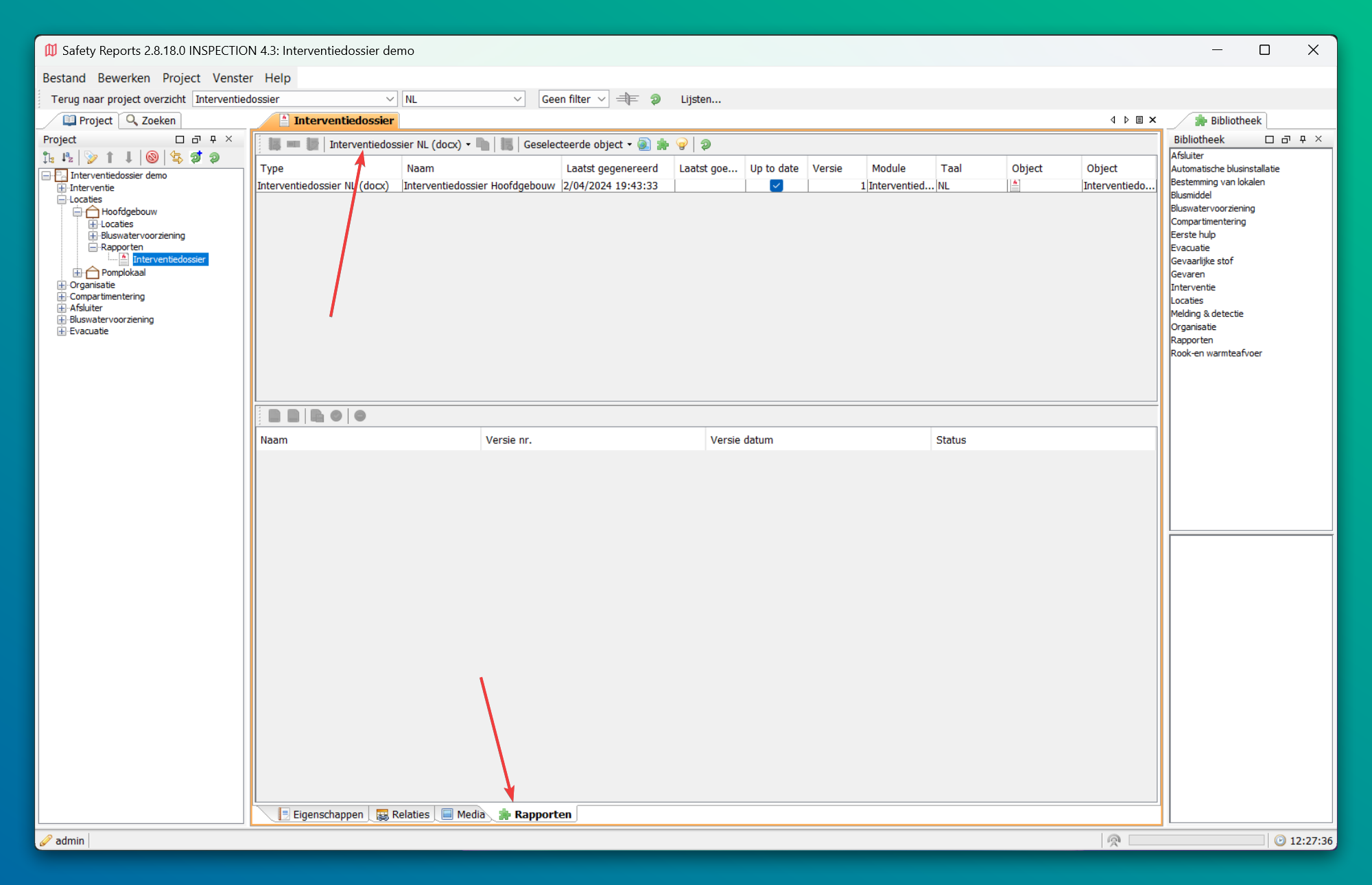 Wanneer alle informatie ingegeven is in de site, verdiepingen en in het interventiedossier kunnen we een rapport aanmaken:
