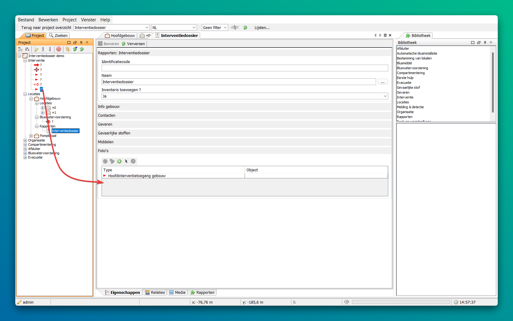 Een interventiedossier voegen we toe per gebouw. In de module Interventiedossier in de categorie Rapporten vind je Interventiedossier en dit icoon sleep je uit de bibliotheek op het gebouw in de project boom. Je opent het nieuwe interventiedossier door erop te dubbel-klikken.