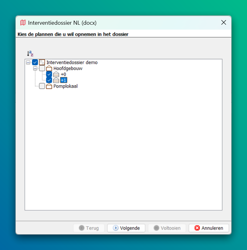 Een nieuwe dialoog komt tevoorschijn waarin je de plannen kan kiezen die je wenst op te nemen in het dossier.