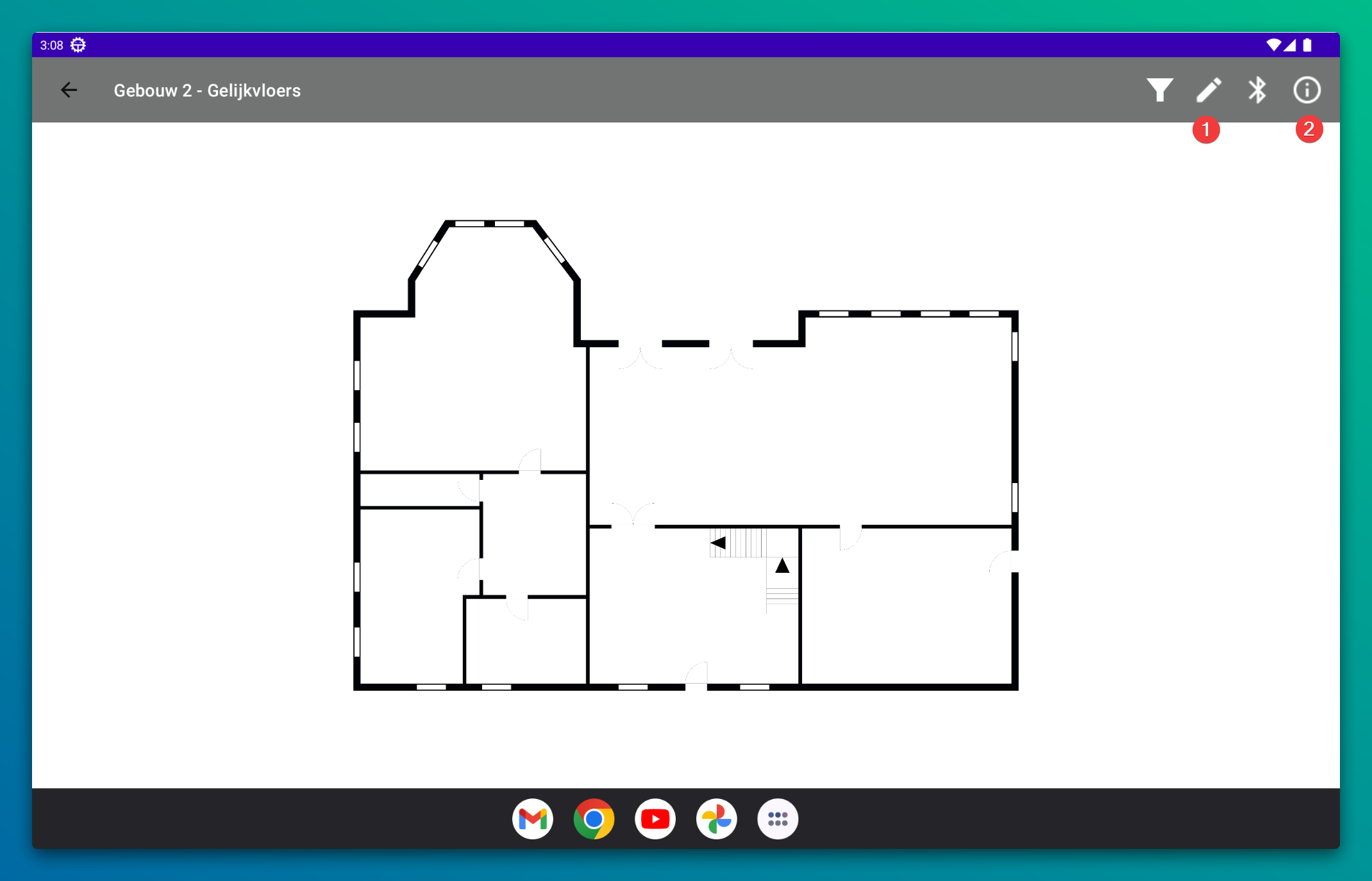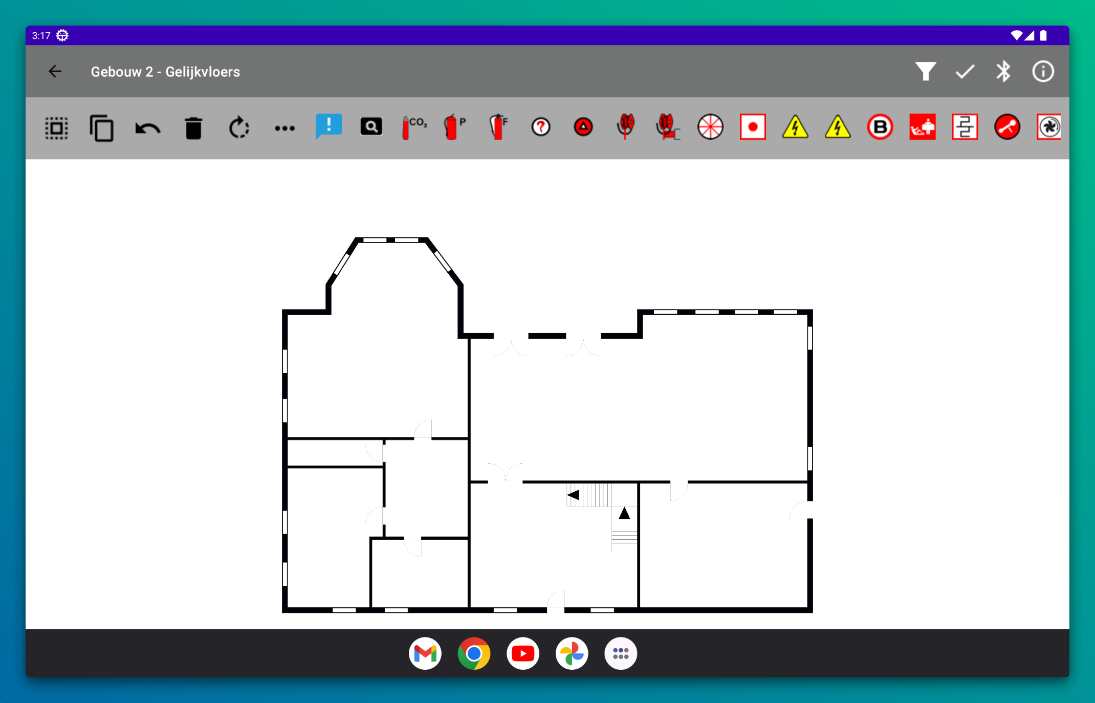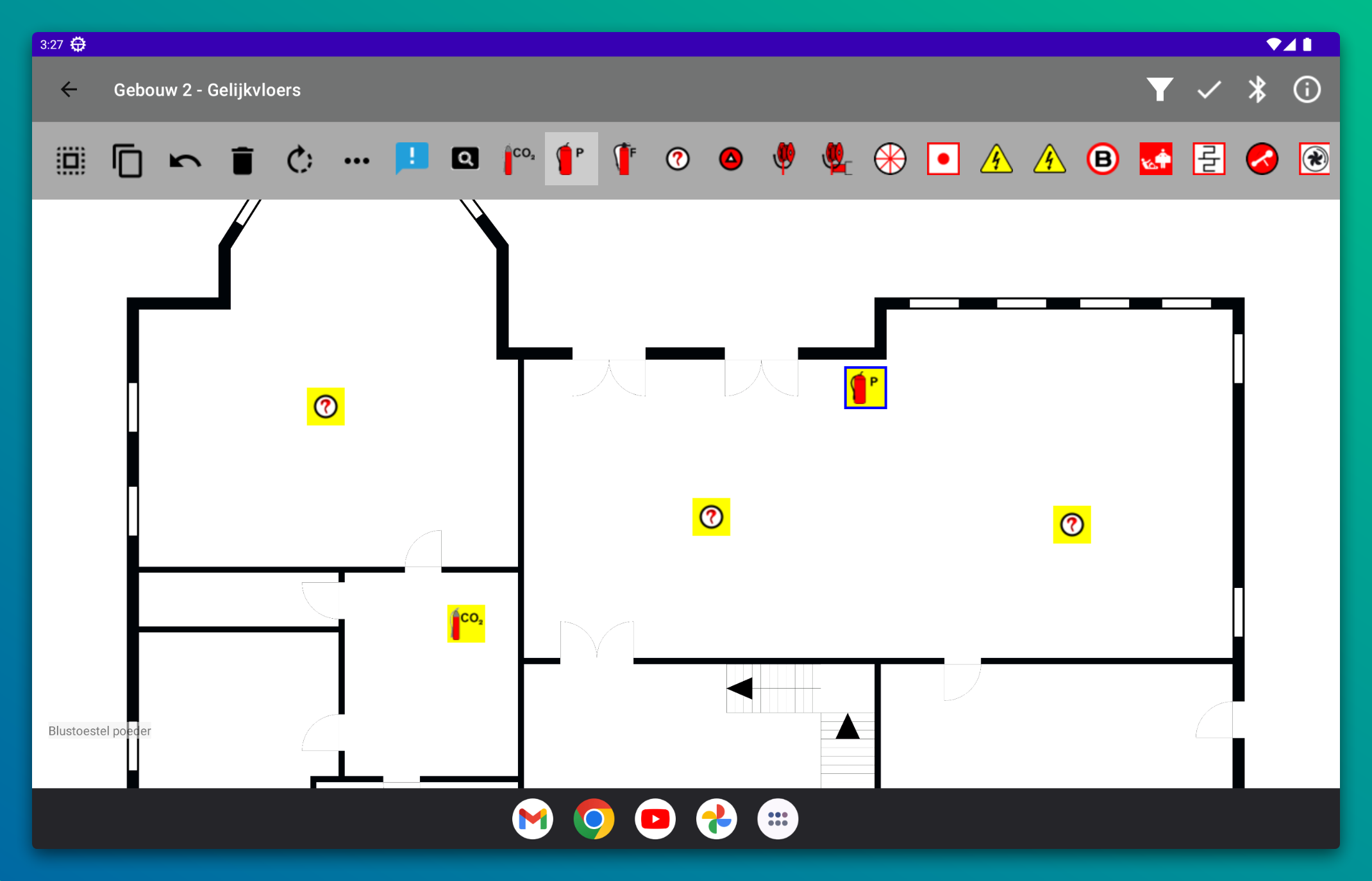 Nieuwe iconen voegen we toe door op het icoon te drukken in de toolbar en dan op de tekening te drukken. Om het icoon te verplaatsen hoef je je vinger niet op het icoon te plaatsen. Zo lang een icoon geselecteerd is beweeg je het door met één vinger over de tekening de bewegen.