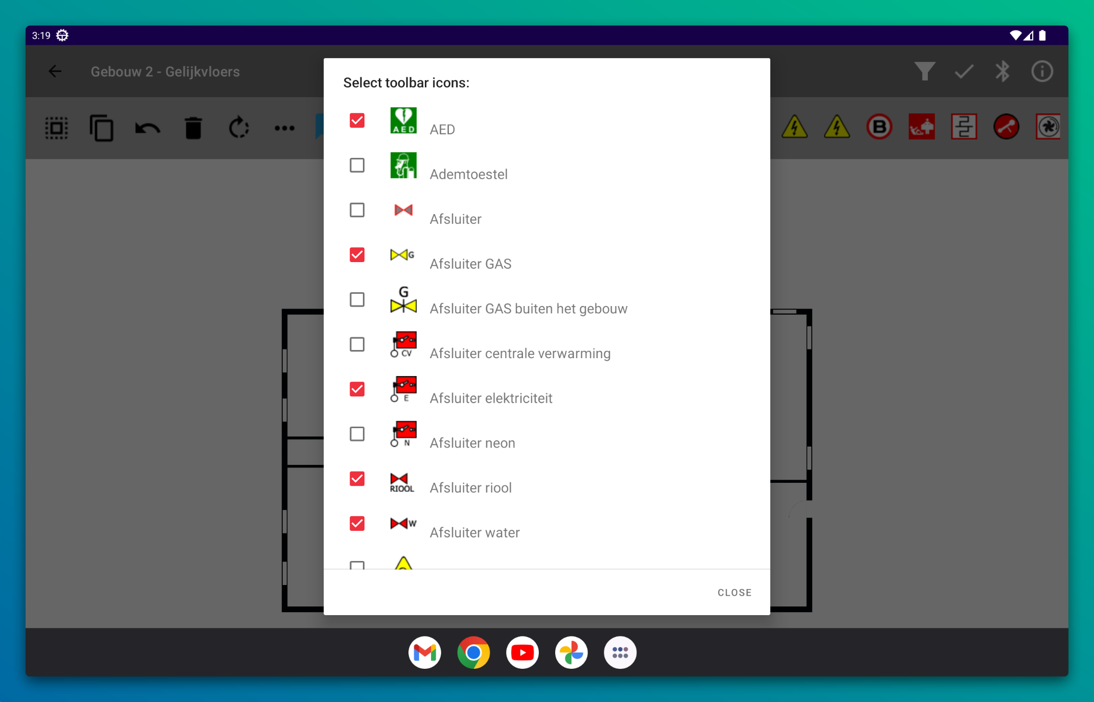 Met de knop bibliotheek aanpassen kan je kiezen welke iconen standaard beschikbaar zijn om op het plan te plaatsen. Alle iconen uit de Safety Reports module "Inventaris" zijn beschikbaar in Safety Walk Expert.